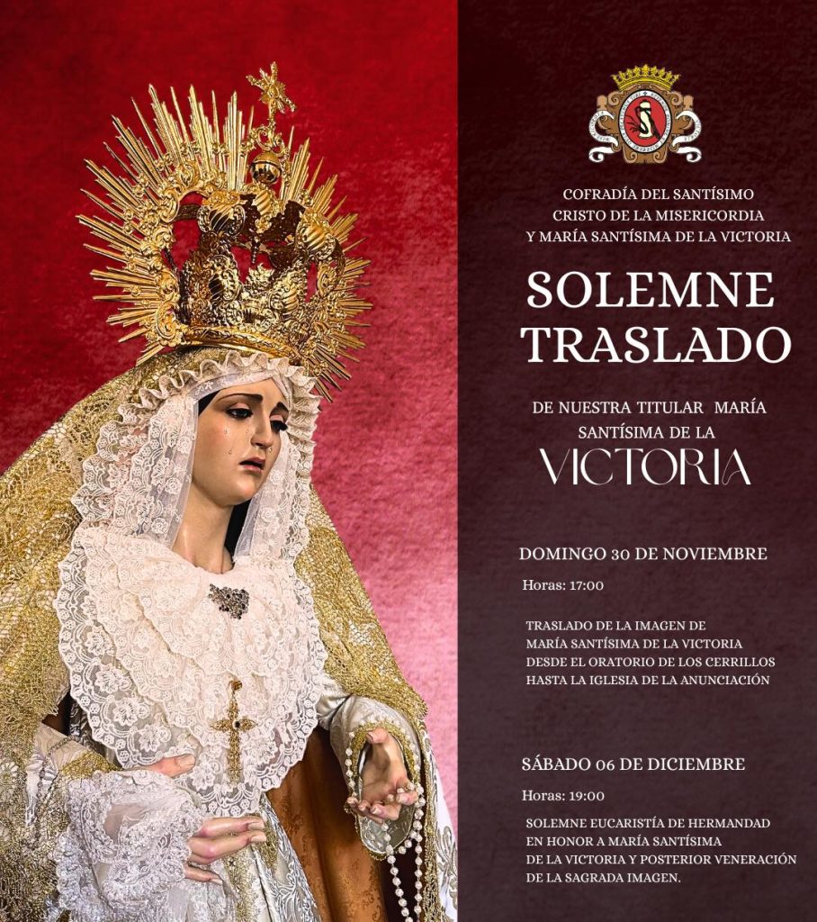 Este domingo 30 de noviembre, a partir de las 17:00 horas, la Cofradía de la Misericordia llevará a cabo el solemne traslado procesional de María Santísima de la Victoria. La comitiva partirá desde el Oratorio de Los Cerrillos y recorrerá diversas calles del municipio hasta llegar a la Parroquia de la Anunciación.