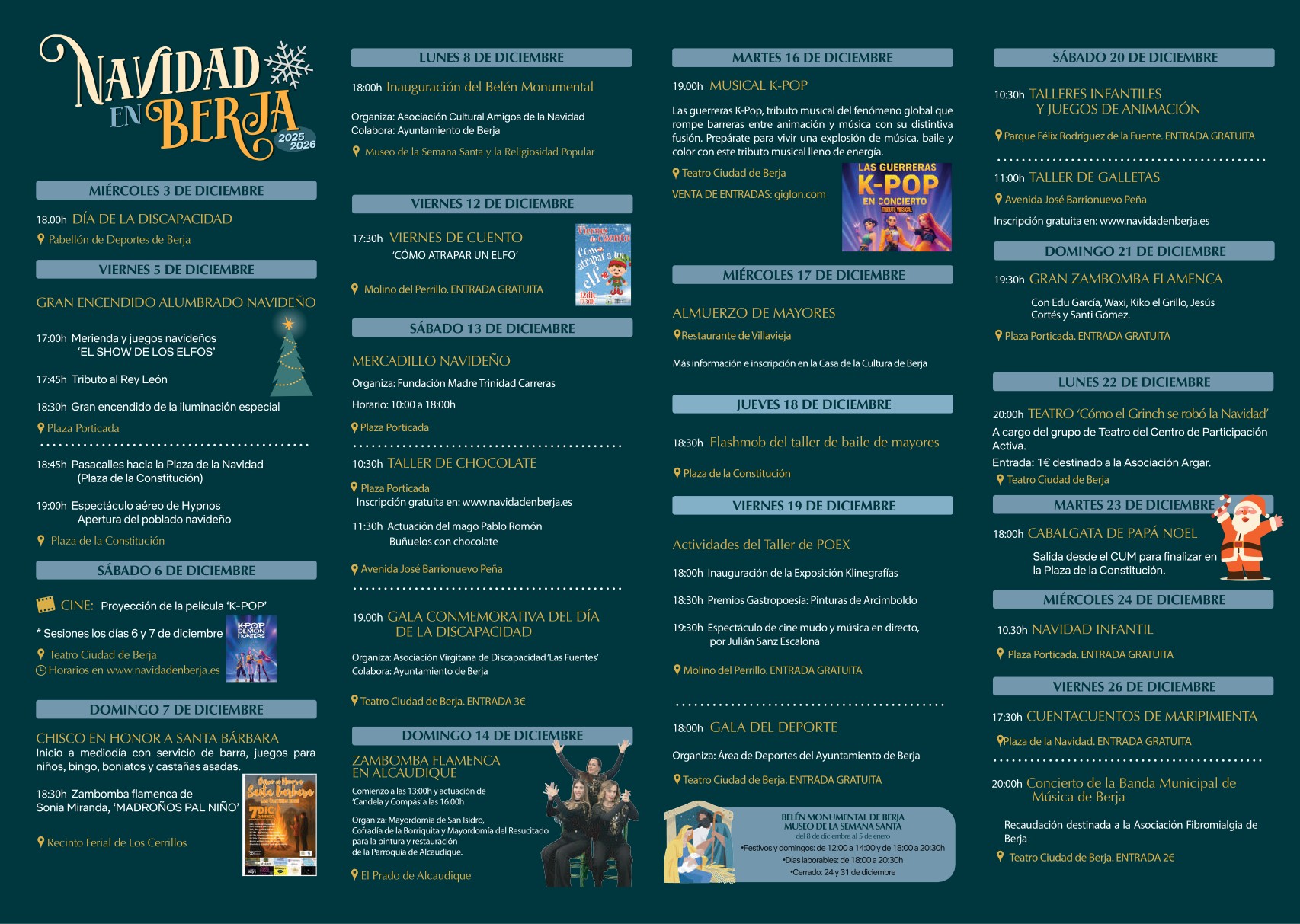 Los fines de semana llegarán repletos de eventos para toda la familia. Habrá cine, pasacalles, espectáculos, talleres y cuentacuentos. Entre ellos destacan el musical K-POP el 16 de diciembre en el Teatro Ciudad de Berja, así como la presencia del mago Pablo Romón el sábado 13 en la Avenida José Barrionuevo Peña, mientras que en la Plaza Porticada se celebrará el mercadillo organizado por la Fundación Madre Trinidad.