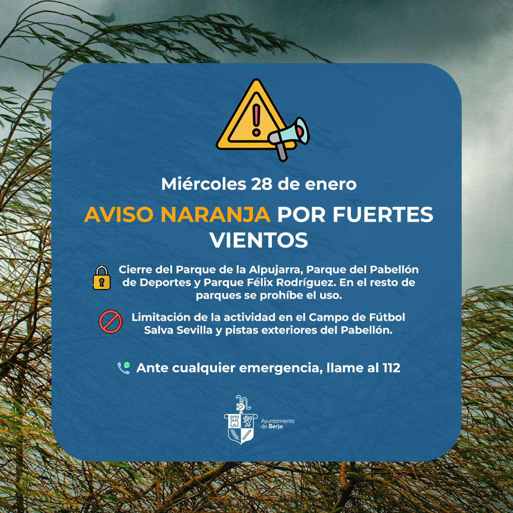 El Ayuntamiento de Berja ha puesto en marcha medidas preventivas con motivo del aviso naranja por fenómenos meteorológicos adversos emitido por la Agencia Estatal de Meteorología (AEMET) y previsto para este miércoles 28 de enero. El objetivo es garantizar la seguridad de la población ante la previsión de fuertes rachas de viento y posibles precipitaciones intensas.